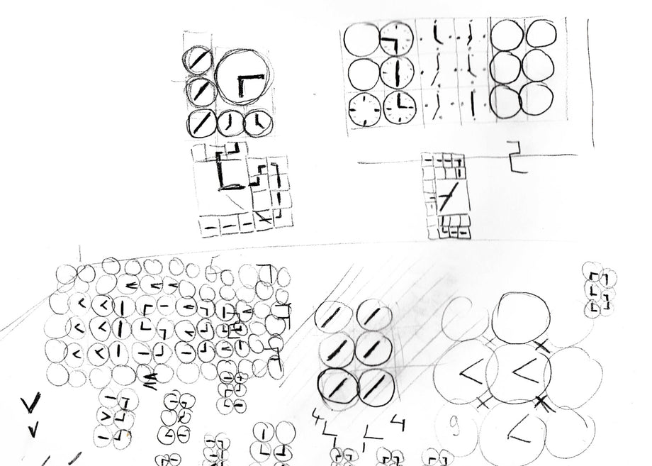 The duo started experimenting with patterns of randomly fallen toothpicks and devised an animated font system based on moving clock faces. They made the clock hands stop in certain positions to create letters and digits. Once the clock hands rotated again, the characters would fall apart.