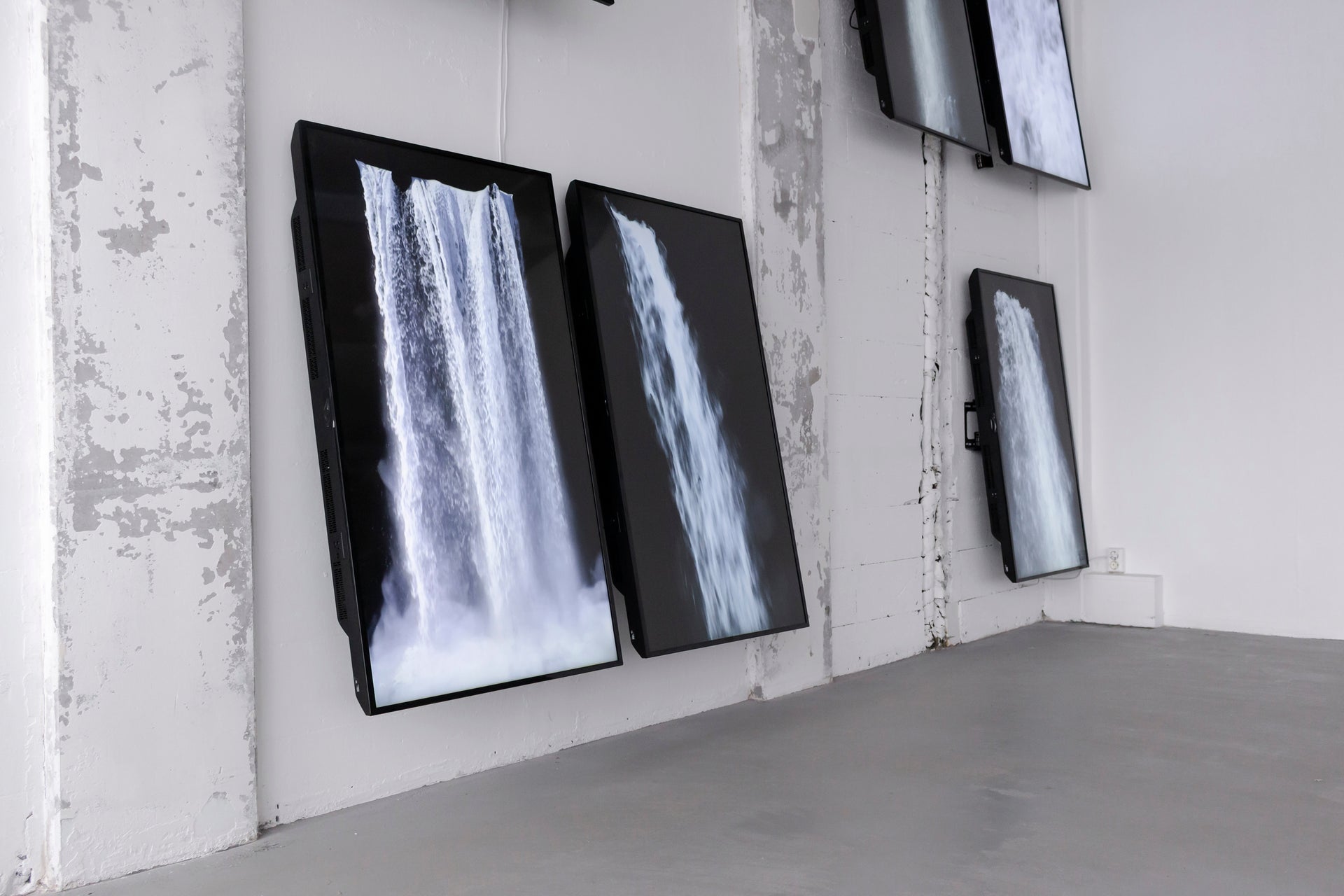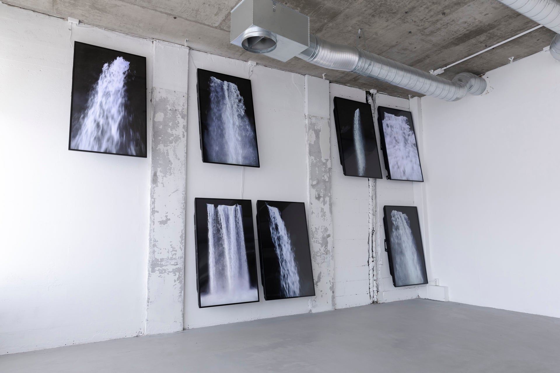 Collection of Motion: Waterfalls (Cascade) comprises up to twenty unique, digitally simulated loops of waterfalls based on real-world falls. Every detail of waterfalls; their speed, volume, light and reflections have been generated to create motion that bears an uncanny near-realism to natural, ephemeral waterfalls. These visual simulations are distinct in that they do not flow continuously but repeatedly start and end, capturing the idealised form of a waterfall, a dreamlike spectacle that is rarely witnessed. By creating and presenting a multiplicity of waterfalls alongside one another, and establishing relationships among them, Collection of Motion: Waterfalls explores what it is that makes a waterfall a waterfall and the attempt of the mind to grasp at the very nature of a thing. Accompanied by the audio of thundering water, Waterfalls (Cascade) is a powerful and immersive large-scale installation, that retains a natural meditativeness despite its digital production process.